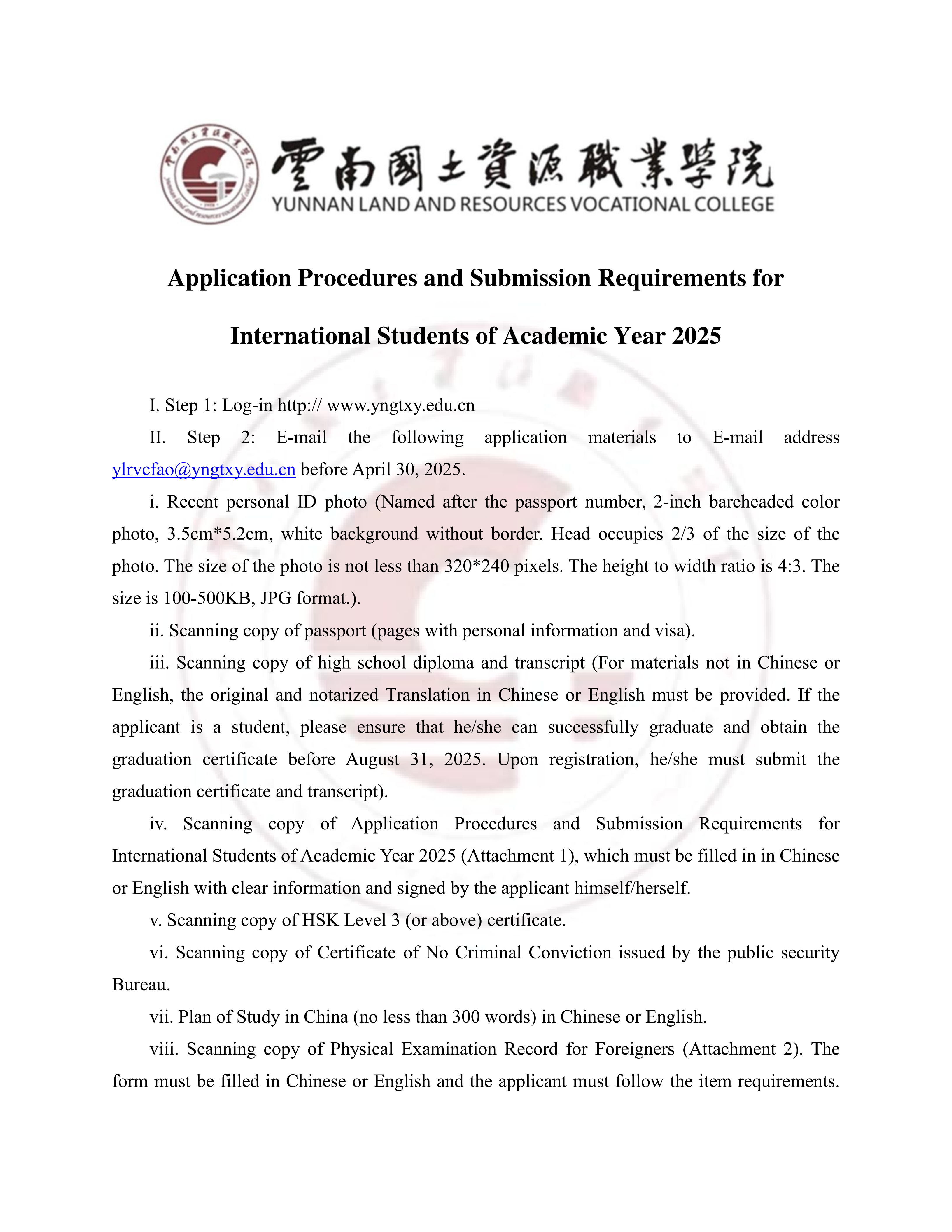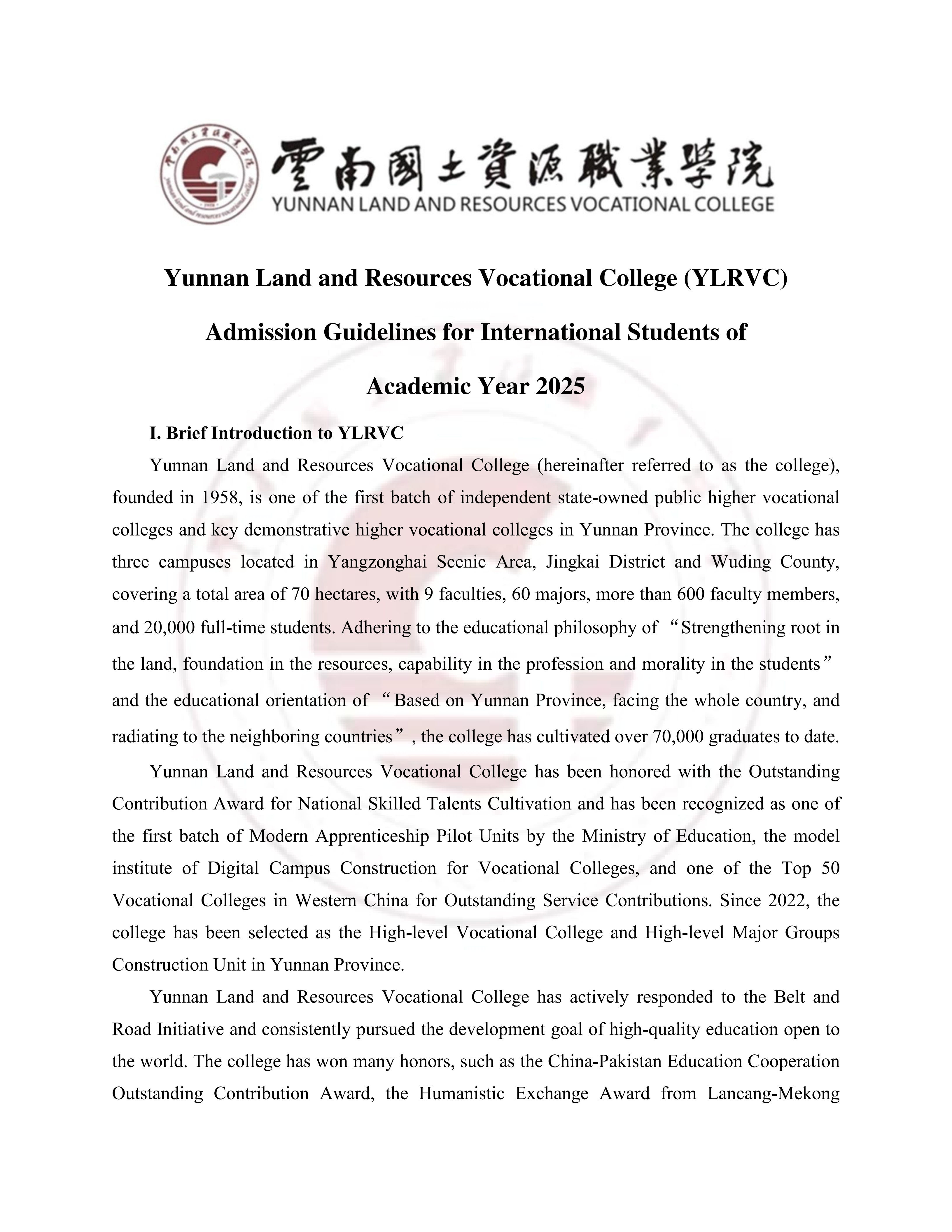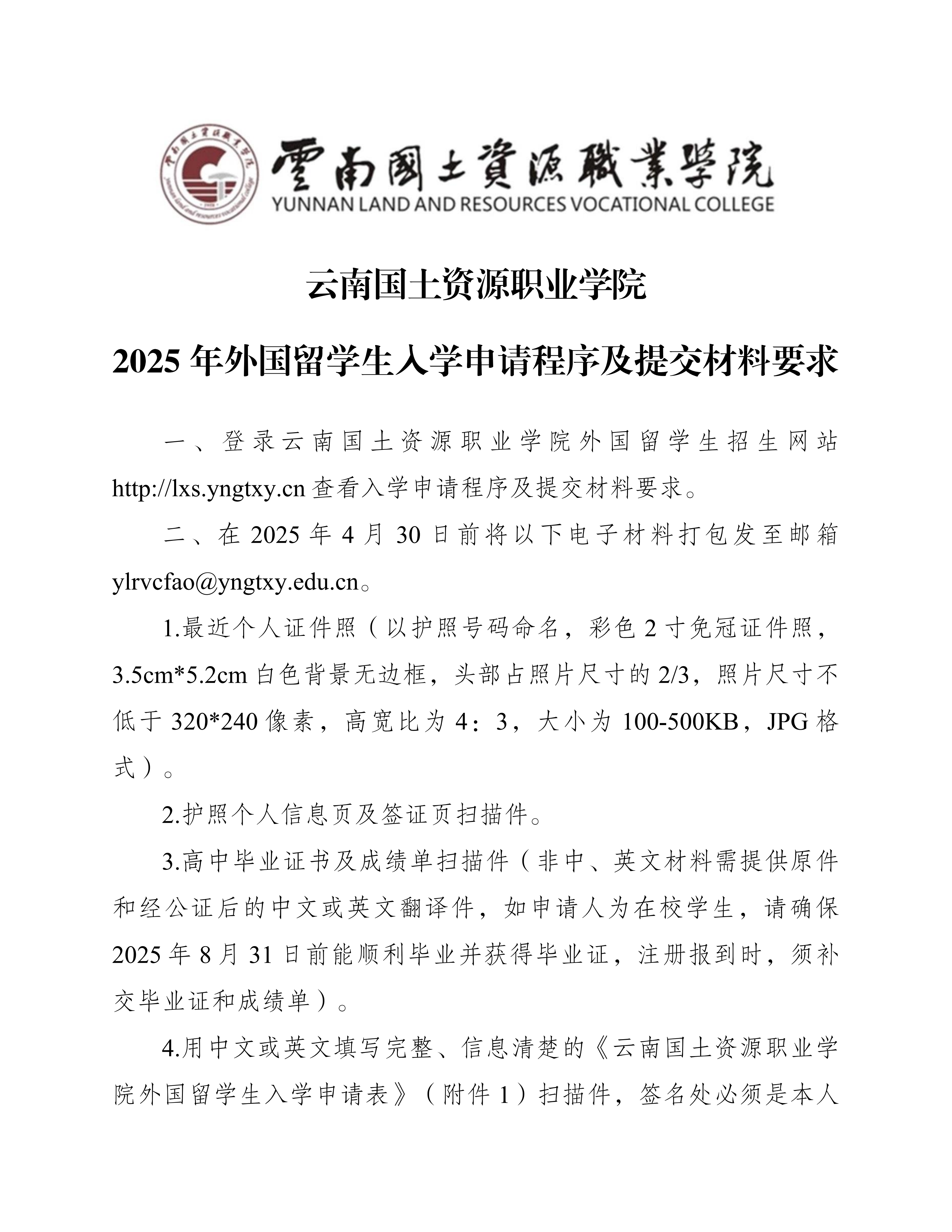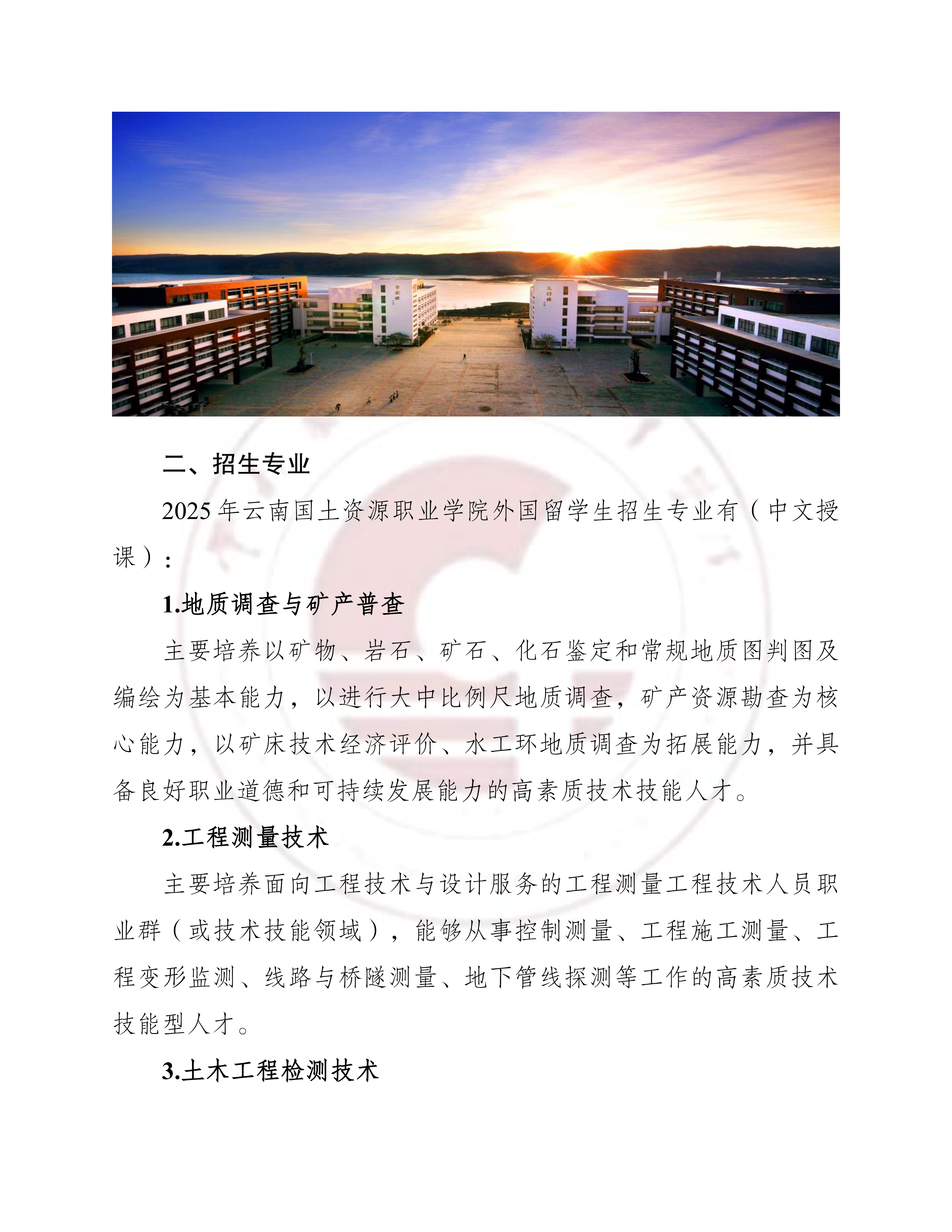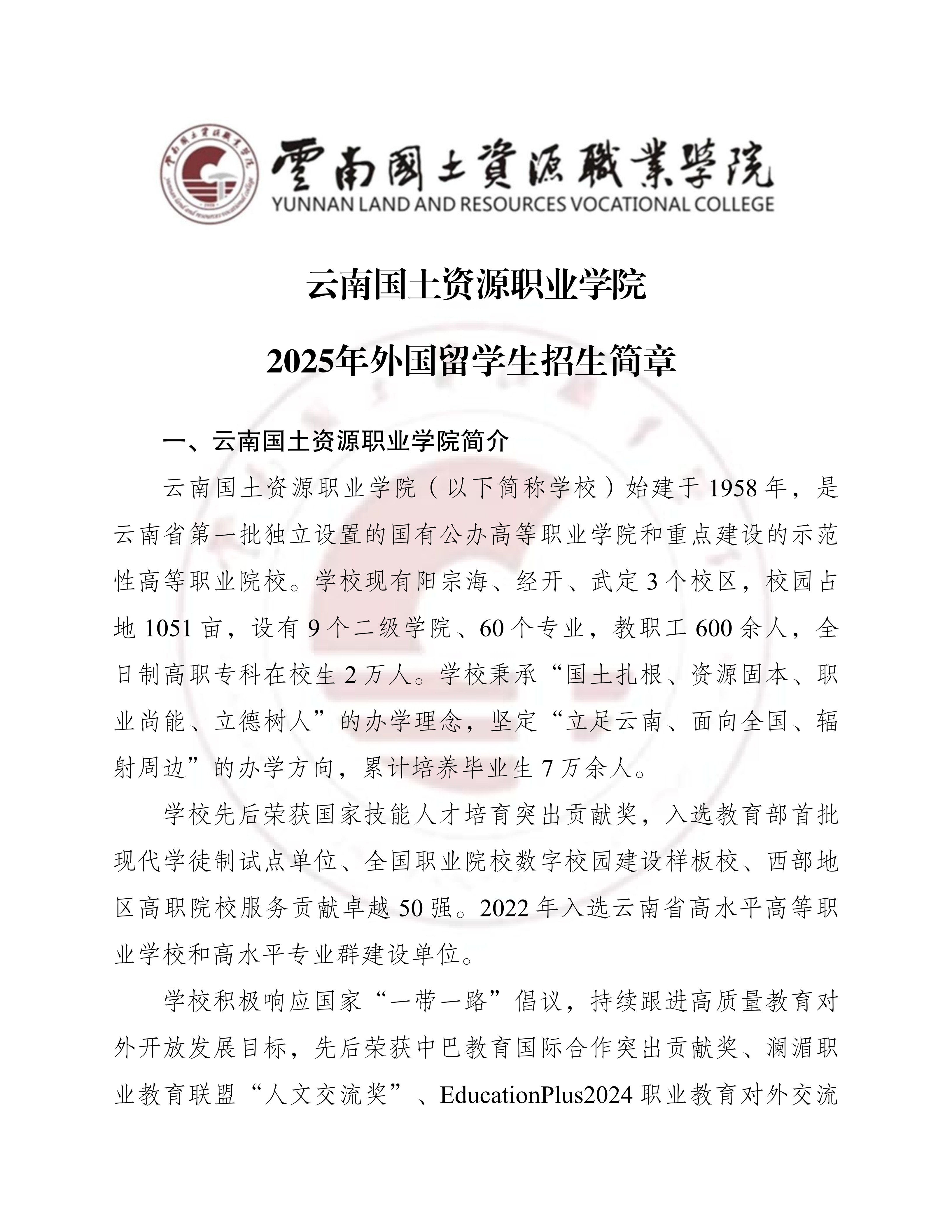 云南国土资源职业学院 2025 年外国留学生招生简章